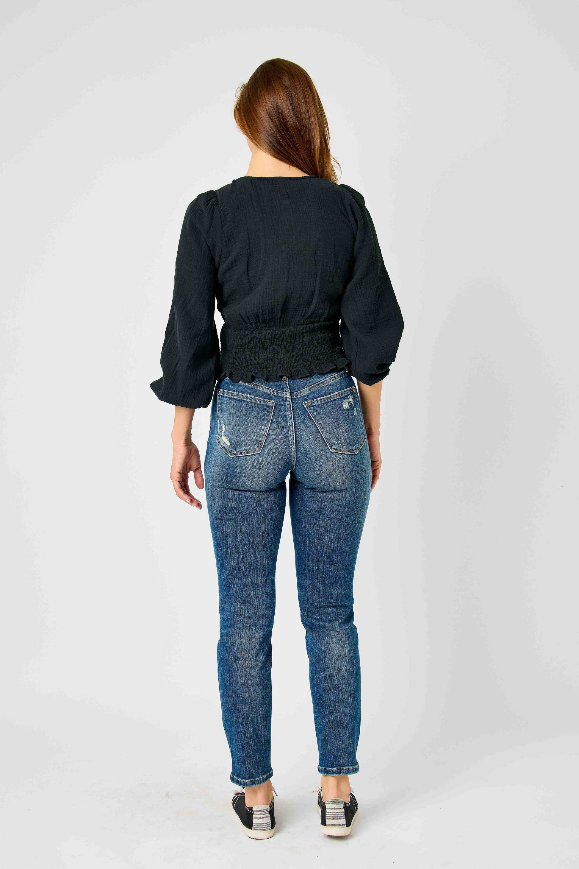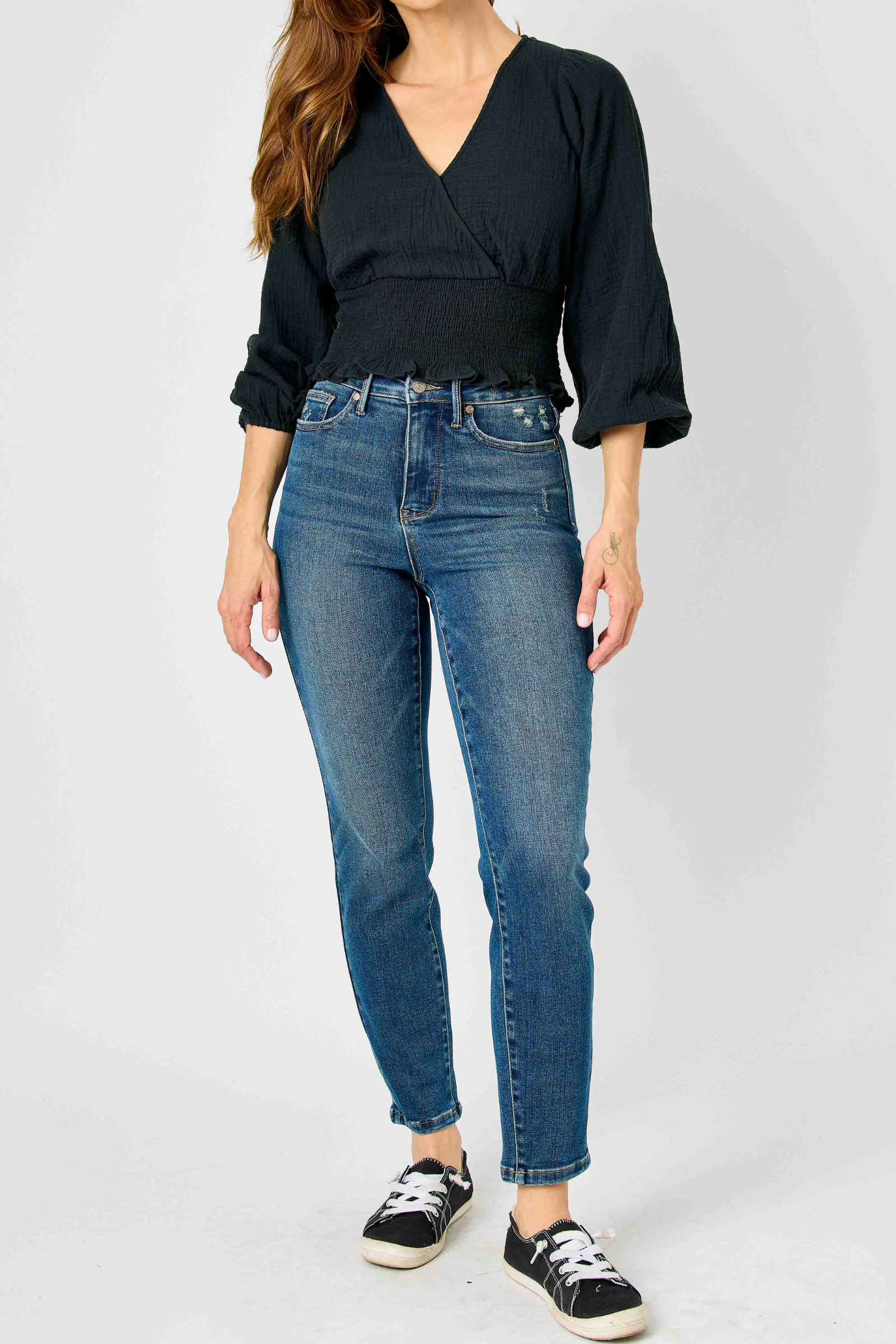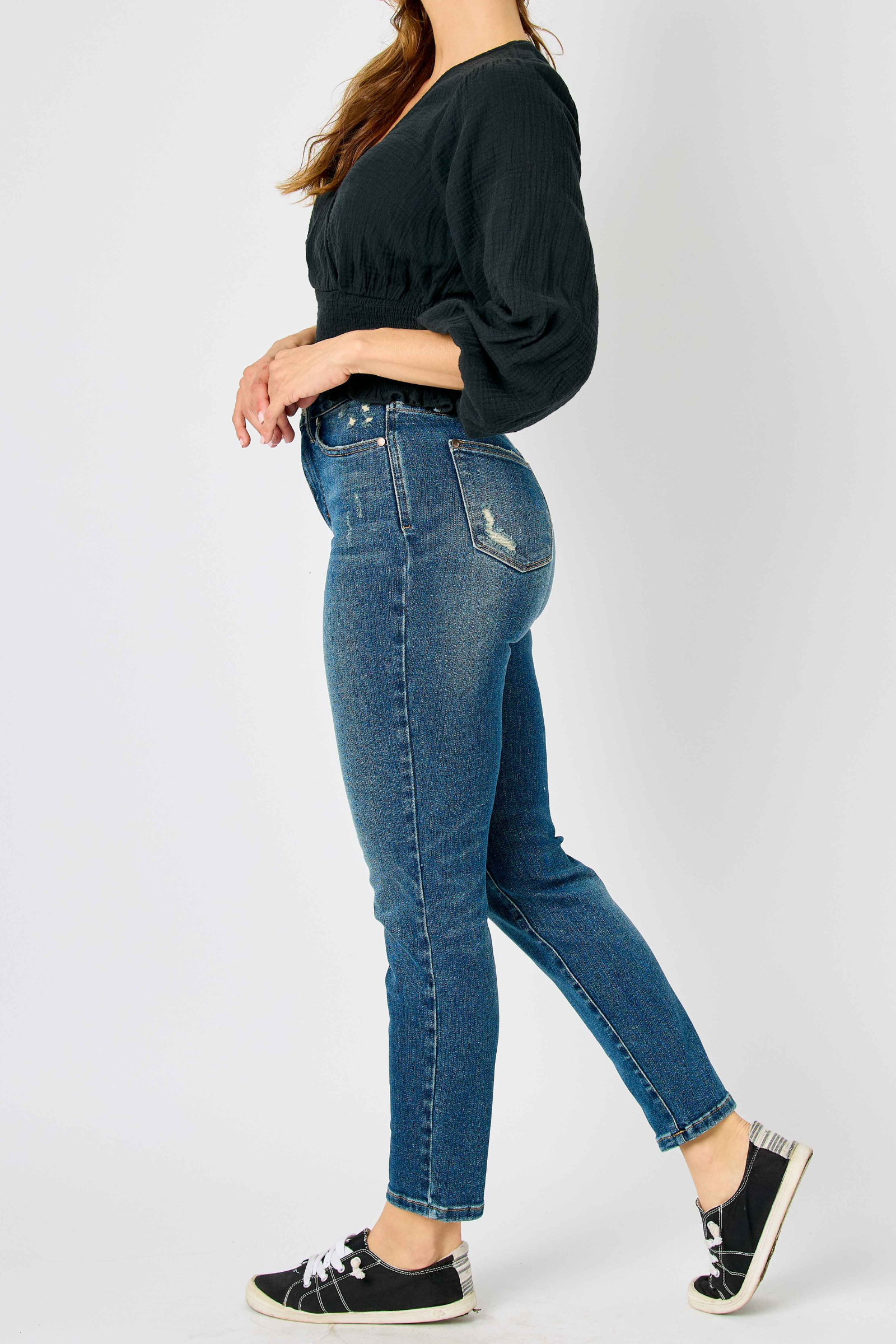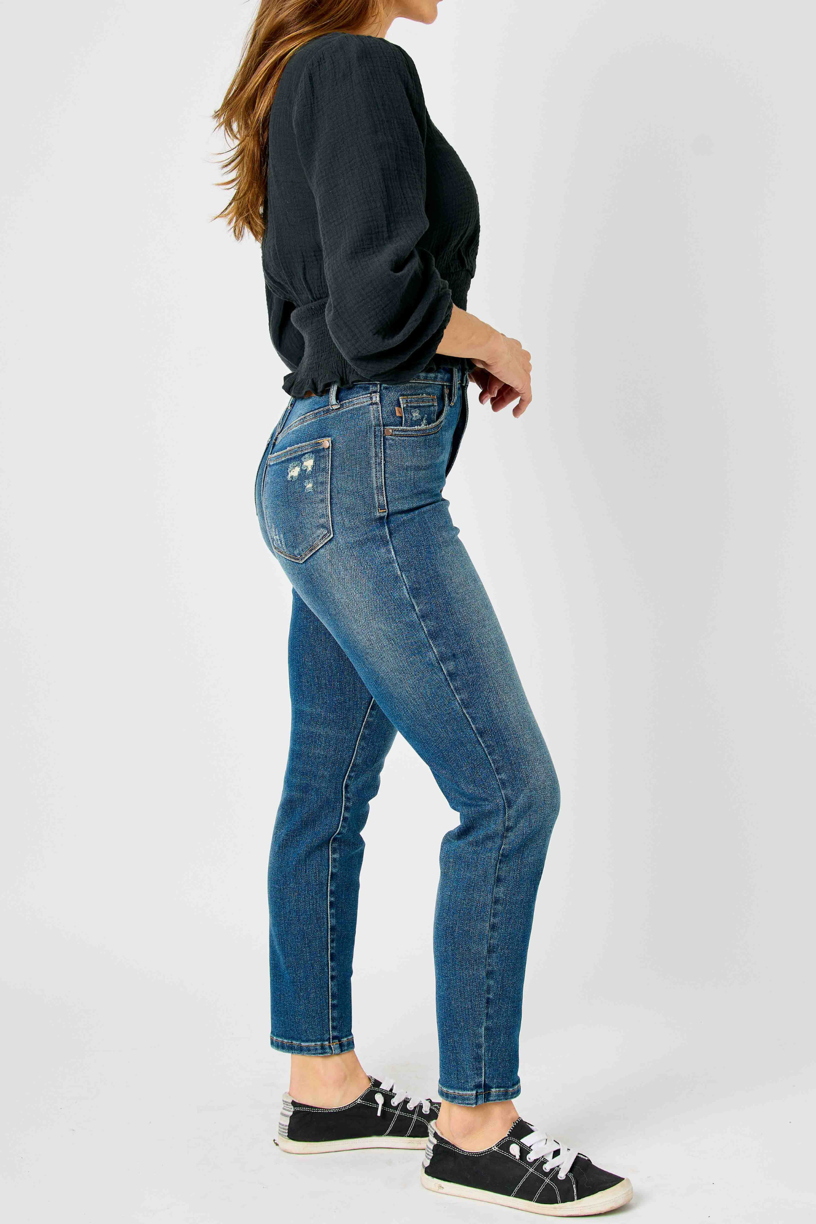 Sleek, flattering, and effortlessly versatile, the Judy Blue Dark Vintage High Waist Slim Jeans are designed with a built-in tummy control panel for a smooth, confident fit. Featuring a dark vintage wash and just the right amount of light distressing around the front and back pockets, these jeans deliver a timeless look with a touch of edge.