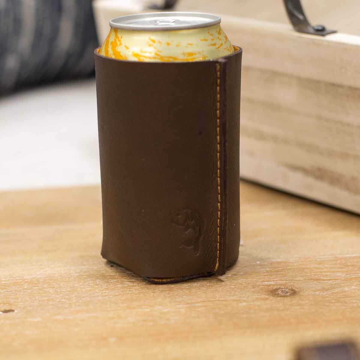 Keep your drinks cool in rugged style with this Dark Brown Leather Can Cooler. Designed to fit standard cans, this cooler combines functionality with timeless craftsmanship.
